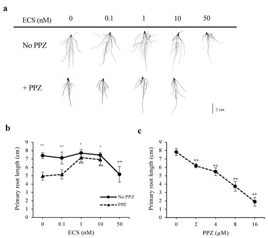 Effect of ECS and PPZ treatments on rice root growth. Root phenotypes of rice seedlings grown for 5 d under different concentrations of ECS or PPZ or combination of ECS and PPZ (4 μM). (a) Representative images of roots grown under different treatments. Scale bar = 2 cm. (b,c) Quantification of primary root length. Data are means ± SD (n = 10 biological replicates). Significant differences between the treatment and the mock control are indicated by ** for p < 0.001. Significant differences between PPZ and no PPZ (with the same ECS concentration) are indicated by + and ++ for p < 0.05 and 0.001, respectively.