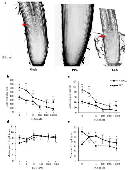 To understand how BR regulates cell proliferation and elongation in the root apices, primary root tips of seedlings grown in the presence or absence of PPZ were treated with ECS for 24 h and observed under microscope. Quantification of cell number and cell length in the 4th cortical layer of the root meristem showed that PPZ treatment increased root meristem size and meristem cell number, but reduced cell length (Figure 2a–d). ECS treatments reduced meristem size and meristem cell number in a dose-dependent manner under both PPZ and no PPZ conditions. Treatment of 10 nM ECS for 24 h could restore meristem size, meristem cell number and cell length of PPZ-treated roots to those of the untreated control (Figure 2b–d). Higher concentrations of ECS strongly reduced meristem size and meristem cell number but did not further increase meristem cell length (Figure 2b–d). This result suggests that BR had a negative effect on root meristem size and meristem cell number and a positive effect on meristem cell elongation.