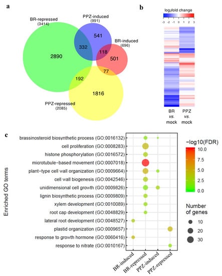 Transcriptomic analysis of differentially expressed genes in ECS- and PPZ-treated rice roots. (a) Venn diagram showing the overlap between the lists of significant ECS-induced, ECS-repressed, PPZ-induced and PPZ-repressed genes (|fold change| > 1.5; adjusted p-value < 0.05). The numbers of DEGs are shown in parentheses. (b) Hierarchically clustered heatmap displaying the log2FC values of all significant genes in the ECS vs. mock or PPZ vs. mock comparisons. (c) GO biological process term enrichment analysis of the ECS and PPZ DEG lists.