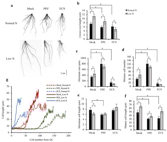 Effect of ECS and PPZ treatments on root growth responses to N deficiency. Germinated seeds were grown in normal N for 5 d and then transferred to either normal N or low N conditions containing 10 nM ECS or 4 μM PPZ or mock for 7 d. (a) Representative images of roots grown under different treatments. Scale bar = 2 cm. (b) Crown root length was calculated from the average of the three longest crown roots. Data are means ± SD (n = 10 biological replicates). (c–g) Quantifications of root meristem size (c), meristem cell number (d) and average meristem cell length (e) in the crown roots were determined from cortical cells in the 4th cortical layer by measuring from the QC to the first elongated cell. Mature cell length (f) was determined from the average length of five adjacent mature cortical cells. (g) Average cortical cell length along the longitudinal root axis from the QC illustrated the number of cells in the meristem, the onset of rapid cell elongation and the effect of low N on promoting cell elongation under mock and ECS treatments but not PPZ treatment. Data are means ± SD (n ≥ 6 biological replicates). Significant differences are indicated by * for p < 0.05.