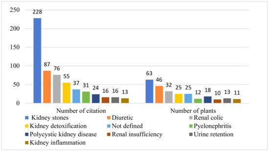 Traditionally, the local population uses the species inventoried in this survey to treat a wide range of kidney symptoms. Nevertheless, it should be noted that the most mentioned kidneys symptoms (Figure 5) are kidney stones (228 citations, 63 plants), followed by diuretic (87 citations, 46 plants), renal colic (76 citations, 32 plants), kidney detoxification (55 citations, 25 plants) and Pyelonephritis (31 citations, 12 plants). Some species such as H. hirsuta (106 use reports), A. graveolens (71 use reports), and P. crispum (52 use reports) were the most commonly used species for the treatment of kidney symptoms. The aerial parts of H. hirsuta, in decoction, are used against kidney stones, the infused leaves are used against Pyelonephritis and renal colic, the whole plant, in decoction, is used to relieve pain in the kidneys, and as well as for detoxifying the kidneys. The aerial part of A. graveolens, in decoction, is used against swelling of the kidneys, decocted roots are used to improve the kidneys’ performance, and the infusion of the aerial part against renal colic and kidney stones.