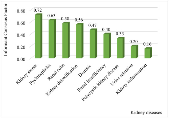 The ICF was calculated for each category of renal symptoms, and the index values range from a maximum significance value of 0.72 to a minimum value of 0.16 (Figure 6). Based on these results, we noted that the highest values of this index (ICF) were recorded for kidney stones (ICF = 0.72) with 63 plant species, followed by Pyelonephritis (ICF = 0.63) with 12 plant species, renal colic (ICF = 0.58), kidney poisoning (ICF = 0.56) and diuretic (ICF = 0.47). High values (close to 1) of this index for kidney stones and pyelonephritis indicate that few species were used by a large proportion of informants for each of these two disease categories. For kidney inflammation and urinary retention, the index values were ICF = 0.16 and ICF = 0.22, which means that the number of citations is almost equal to the number of plants used by informants to treat these symptoms. High ICF values for kidney stones may be due to their high incidence of occurrence in the study area [37].