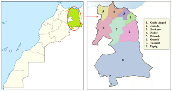 The study was conducted in North-Eastern Morocco (Figure 10). This region is limited in the North by the Mediterranean Sea (200 km of coastline), in the East by Moroccan-Algeria fronter, in the south by part of the desert (Figuig province), and in the west by a part of middle Atlas (Taza province). The region includes Benisnassen, Rif, and Horst’s mountainous area, culminating respectively to 1800 m and 1500 m. These geographical features provide the region with a Mediterranean climatic zone that is characterized by hot and dry summers while winters are more cool and wet with average rainfall between 100 mm per year in the South (Saharan bioclimatic zone) and 400 mm per year in the North (Influenced by the Mediterranean Sea). Additionally, the region encompasses several Sites of Biological and Ecological Interest (SBEI) and protected areas such as Benisnassen, Jbel Gorougou. Indeed, these sites had already been identified for their original flora as well as for their biological and ecological qualities [4]. According to the national census conducted in 2014, the region’s total area is 90,130 km2, representing 12% of the national territory. Historically, North-Eastern Morocco people have a shared cultural past dating back to the Arab civilization in the seventh century. The cumulative traditional culture, related to ethnobotanical knowledge, has been maintained until now and constitutes the basis for the region’s traditional medical system [6,7].