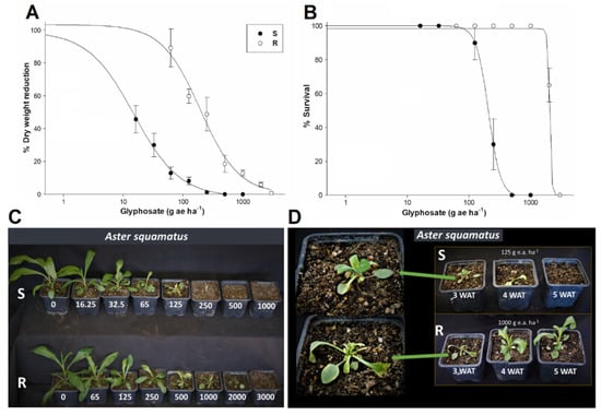 Glyphosate dose-response curves of the dry weight reduction (A) and plant survival (B) in susceptible (S) and resistant (R) saltmarsh aster (A. squamatus) populations treated with different glyphosate doses (g ae ha−1). Vertical bars are the SEM (n = 10 for weight reduction and n = 2 for plant survival). (C) R and S plants at 4 weeks after treatment (WAT) of glyphosate. (D) Regrowth of S and R plants treated with 125 and 1000 g ae ha−1 glyphosate, respectively, at different WATs.