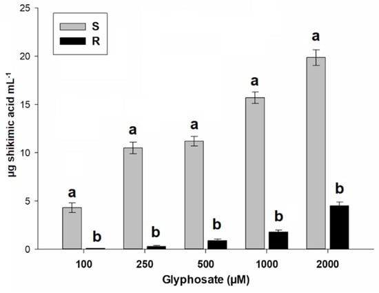 Accumulation of shikimic acid accumulation induced by glyphosate in susceptible (S) and resistant (R) saltmarsh aster populations (A. squamatus) found in Persian lime groves from Veracruz, Mexico. Vertical bars represent the standard error of the mean (n = 6). Different letter denotes differences between populations within a glyphosate by the Tukey test (p < 0.05).