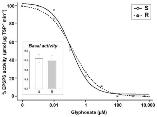 EPSPS basal and enzymatic activities of both saltmarsh aster populations showed no statistical differences. EPSPS activities of the S and R populations were 0.64 and 0.59 µmol of inorganic phosphate (Pi) released per µg of total soluble protein (TSP) per min (µmol Pi µg−1 TSP min−1), respectively, and only ~0.25 µM of glyphosate inhibited the EPSPS activity by 50% in both populations (Figure 3, Table 1).