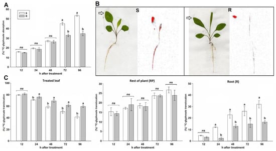Absorption and translocation of 14C-glyphosate in susceptible (S) and resistant (R) saltmarsh aster (A. squamatus) populations from 12 to 96 h after treatment (HAT). (A) 14C-glyphosate absorption (% from the total applied). (B) Digital (on the left) and autoradiograph (right) images illustrating the 14C-glyphosate distribution within plants at 96 HAT. Red regions show higher signal (concentration) of 14C. (C) 14C-glyphosate translocation (% of the recovered) from the treated leaf to the rest of the plant, and roots. Vertical bars represent the standard error of the mean (n = 5). ns, no significant and different letter denotes differences between populations within an evaluation time by the Tukey test (p < 0.05).