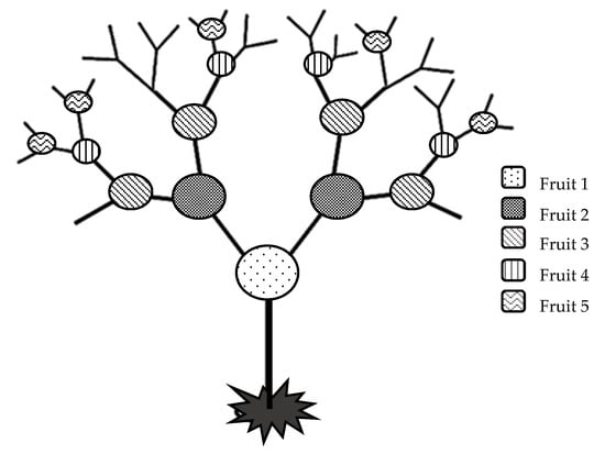 The fruits were picked from three different species (C. annuum, C. chinense, and C. baccatum), when the cultivar-specific color was reached. In C. annuum ‘Cayenne’ and C. baccatum ‘Bishop Crown’, the color at harvest was red and in C. chinense ‘Habanero Orange’ orange as reported by Zamljen, et al. [11]. For each cultivar, fruits of six plants from the first, second, third, fourth, and fifth levels were collected (Figure 1), except for C. chinense ‘Habanero Orange’ where only four levels of fruit of could be picked. Each individual fruit was first weighed and then the three fruit parts (pericarp, placenta, and seeds) were separated with a scalpel. All fruit parts were then lyophilized (freeze-dried) individually and stored at −20 °C until sugar, organic acids, total phenols, and capsaicinoids were extracted.