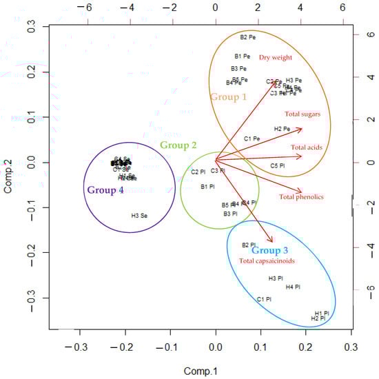 Biplot corresponding to PCA for all samples. Pe = pericarp; Pl = placenta; Se = seed; C = ‘Cayenne’; H = ‘Habanero Orange’; B = ‘Bishop Crown’; cultivar labels were coded 1 to 5 according to picking position within the plant (1, innermost; 5, outermost); Group 1 to 4 = Grouping of samples based on multivariate analysis.