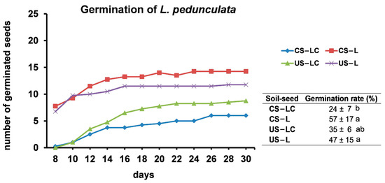 Germination over time and germination rates of L. pedunculata seeds (LC and L) in the soils (US and CS) are shown in Figure 1. Seeds from Serra do Caldeirão (L) had a high and quick germination capability. In fact, approximately eight days after sowing, L. pedunculata seeds from Caldeirão had already germinated independently of the soil (US-L and CS-L), but L. pedunculata seeds from São Domingos did not germinate in any soil (US-LC and CS-LC) (Figure 1). Over time, the germination of LC and L in both soils increased progressively, with the number of germinated seeds from Caldeirão (L) always higher than that of seeds from São Domingos (LC). However, at the end of the assay (after 30 days), the germination rates only showed significant differences among CS-LC (the lowest germination values) and US-LC and US-L.
