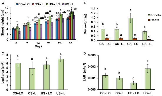 Shoot height (A), dry biomass (B), leaf area (C) and leaf area ratio (LAR) (D) of L. pedunculata (grown from São Domingos seeds (LC) and Caldeirão seeds (L)) planted in the contaminated soil from São Domingos (CS) and the uncontaminated soil from Caldeirão (US). (average ± standard error, n = 4). Different letters indicate significant differences among soil/plant treatments (p < 0.05). * indicates no significant differences among plant/soil combinations (p < 0.05).
