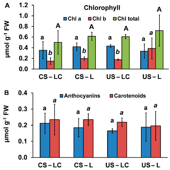 (A) Chlorophyll a (Chl a), chlorophyll b (Chl b) and total chlorophyll (Chl total) contents and (B) anthocyanins and carotenoids contents in shoots of L. pedunculata (from São Domingos seeds (LC) and Caldeirão seeds (L)) planted in the contaminated soil from São Domingos (CS) and the uncontaminated soil from Caldeirão (US) (average ± standard error; n = 4). Different letters—lowercase (Chl a and anthocyanins), italic (Chl b and carotenoids) and uppercase (Chl total)—indicate significant differences among soil/plant treatments (p < 0.05).