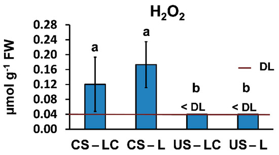 Hydrogen peroxide (H2O2) contents in shoots of L. pedunculata grown from São Domingos seeds (LC) and Caldeirão seeds (L) planted in the contaminated soil from São Domingos (CS) and the uncontaminated soil from Caldeirão (US) (average ± standard error; n = 4). Different letters indicate significant differences among soil/plant treatments (p < 0.05). DL: detection limit.