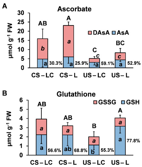 Reduced (AsA) and oxidized (DAsA) ascorbate contents (A) and reduced (GSH) and oxidized (GSSG) glutathione contents (B) in shoots of L. pedunculata grown from São Domingos seeds (LC) and Caldeirão seeds (L) planted in the contaminated soil from São Domingos (CS) and the uncontaminated soil from Caldeirão (US) (average ± standard error; n = 4). Percentage reduction of AsA and GSH are shown in each corresponding graph. Different letters—lowercase (AsA and GSH), italic (DAsA and GSSG) and uppercase (total ascorbate and total glutathione)—indicate significant differences among soil/plant treatments (p < 0.05).