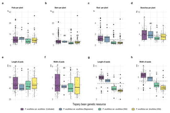 Box plots of the scatter plot for agronomic characteristics at the plant (a–d), pod (a,e,f), and seed (g,h) levels among the tepary bean genetic resource. Dotted line means the overall mean for each variable. Different letters between tepary bean genetic resource indicate different means (p < 0.05).