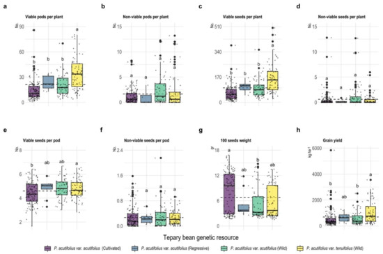 Box plots of the scatter plot for agronomic grain characteristics in terms of viable and non-viable seeds per plant (a–d), viable and non-viable seeds per pod (e,f), 100 seeds weight (g) and grain yield (h) of tepary bean genetic resource. Dotted line means the overall mean for each variable. Different letters between tepary bean genetic resource indicate different means (p < 0.05).