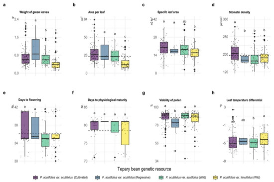Box plots of the scatter plot for morphological (a–d), phenological (days to flowering (e) and days to physiological maturity (f)) and physiological (g,h) characteristics of tepary bean genetic resource. Dotted line means the overall mean for each variable. Different letters between tepary bean genetic resource indicate different means (p < 0.05).
