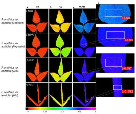 Images of chlorophyll a fluorescence parameters taken in fully developed leaves at the onset of physiological maturity the tepary bean genetic resource: (a) Initial fluorescence (F0), (b) maximum fluorescence (Fm), (c,d) maximum quantum efficiency of PSII (Fv/Fm). (d) An example of the area of interest (AOI) tested on each leaf to obtain the fluorescence variables is shown. Gradient in color change from violet to red means higher to lower value for each variable.