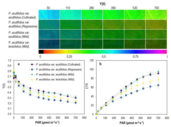 Behavior of the photosynthetic machinery as a function of PAR among the tepary bean genetic resource. (a) Photochemical yield (Y(II)), (b) electron transport rate (ETR). In the upper panel, gradient in color change from violet to red means higher to lower value for each variable. Means and error bars correspond to 20 AOI (area of interest) from four leaves of each accession, i.e., 5 AOI were tested on each leaf.