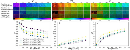 Different energy pathways as a function of PAR among the tepary bean genetic resource. (a) Photochemical quenching (qP), (b) non-photochemical quenching (NPQ), (c) coefficient of non-photochemical dissipation (qN). In the upper panel, gradient in color change from violet to red means higher to lower value for each variable. Means and error bars correspond to 20 AOI (area of interest) from four leaves of each accession, i.e., 5 AOI were tested on each leaf.