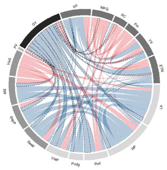Chord diagram of correlation coefficients between agronomic, phenological and physiological variables the tepary bean genetic resource. Ribbons inside the circle correspond to significant correlations with a p-value < 0.05; blue ribbons indicate positive coefficients and red ribbons indicate negative coefficients. Width of pods (WP), length of pods (LP), pods mass (Podg), viability of pods (ViaP), seeds per pod (SepP), weight (g) of 100 seeds (SW), viability of seeds in the pod (ViaP), pollen viability (PV), grain yield (GY), photochemical pathway (qP), fraction dissipated as heat (NPQ), relative chlorophyll (RC), maximum fluorescence level (Fm), photochemical yield (Y(II)), and electron transport rate (ETR).