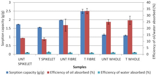 The evidence on the efficiency of the stalk to absorb more oil was due to the size of the natural fibres from the stalk that are larger in diameter, but have lower strength than spikelet [33]. Previous studies found that the galacturonic acid content in spikelets is lower than in stalk, which correlates with the lower cation content [33]. This fact, therefore, resulted in a difference in water absorptivity level between spikelet and stalk. Therefore, thermal treatment for spikelets was not expected to enhance the surface characteristic and sorption capacity.