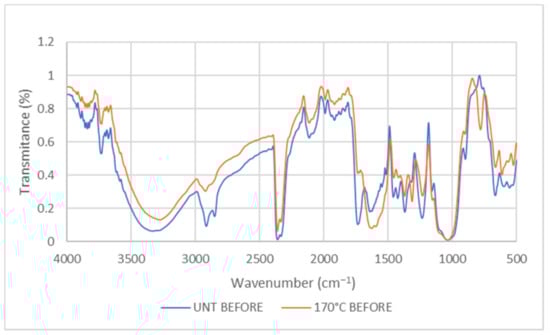 Comparison of IR spectra between EFB untreated and treated with 170 °C samples before wetting with oil. UNT: Untreated.