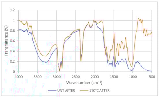 Comparison of IR spectra between EFB untreated and treated with 170 °C samples after wetting with oil. UNT: Untreated.
