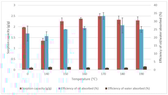 Effects of temperature on EFB treated fibre. Data obtained were the average efficiency of oil absorbed (%), the efficiency of water absorbed (%), and sorption capacity (g/g) on temperature. Vertical bars indicate SEM of three replicates.