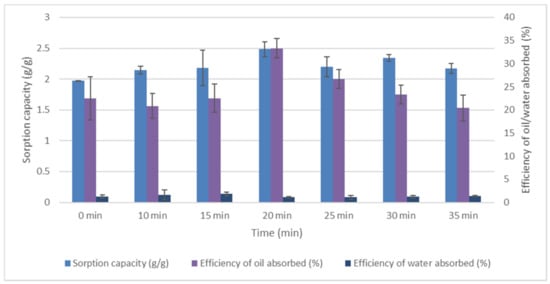 Effects of time on EFB treated fibre. Data obtained were the average efficiency of oil absorbed (%), the efficiency of water absorbed (%), and sorption capacity (g/g) on temperature. Vertical bars indicate SEM of three replicates.