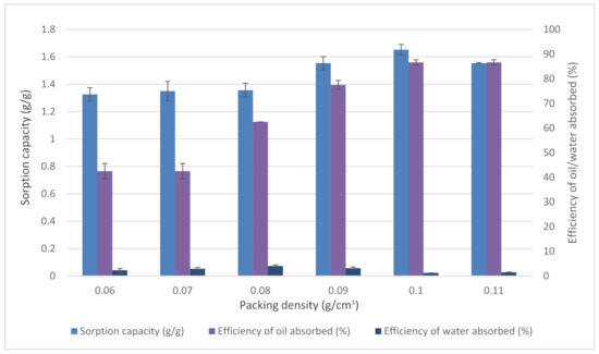 Packing density significantly influenced the efficiency of oil or water absorbed and sorption capacity (Figure 7). The result indicates that the increase of packing density affected the efficiency of oil absorbed up to 0.1 g/cm3. A further increase to 0.11 g/cm3 did not increase the oil absorbed and sorption capacity. The decrease of oil absorbed after a packing density of 0.1 g/cm3 was due to less space available for oil sorption [52]. At low packing density, the efficiency of oil absorbed is low. This was made evident from the size of pores between the inter-fibre distance that became large due to non-compacted samples, causing the fibre not to have sufficient capillary pressure to absorb oil [53]. At the loose packing condition such as 0.06 g/cm3 and 0.07 g/cm3, there was an insufficient utilisation of samples that resulted in low oil absorption [54]. It was found that higher and lower packing density corresponded to lower oil absorbed and sorption capacity.