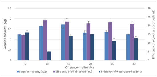 Effects of oil concentration on EFB treated fibre. Data obtained were the average efficiency of oil absorbed (%), the efficiency of water absorbed (%), and sorption capacity (g/g) on temperature. Vertical bars indicate SEM of three replicates.