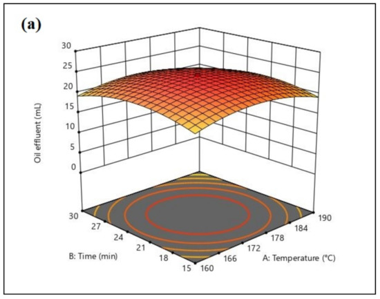 CCD results of 30 runs are listed in Table 5. The highest oil absorbed was obtained at the condition of 175 °C, 22.5 min, and 0.095 g/cm3 with 10% diesel. The lowest oil absorbed was obtained at 175 °C, 22.5 min, and 0.095 g/cm3 with 0% diesel.