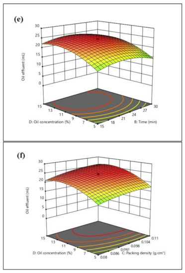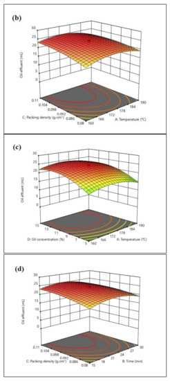 3D Contour plots generated by Design Expert (Stat Ease, Inc., Minneapolis, USA) of the significantly interacting model terms: (a) A: temperature and B: time, (b) C: packing density and A: temperature, (c) D: oil concentration and A: temperature, (d) C: packing density and B: time, (e) D: oil concentration and B: time, and (f) D: oil concentration and C: packing density.