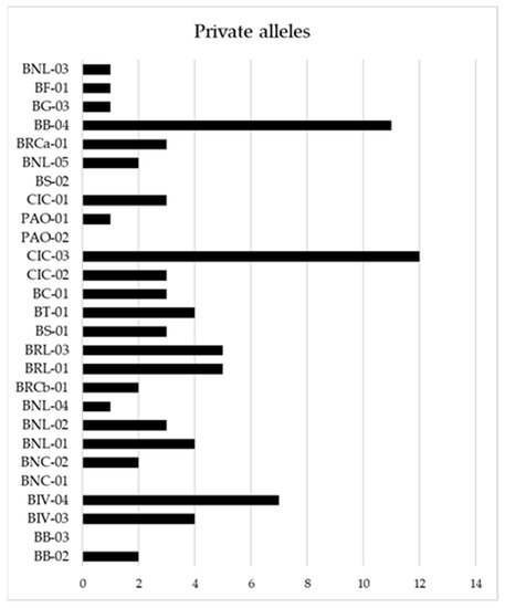 A list of private alleles, alleles that are found only in a single population among the broader collection, of each genotype is also reported in Figure 1. The figure shows that Bufala Bianca 04 (BB-04), Ciciredda 03 (CIC-03) and Bivona 04 (BIV-04) are the three landraces with the highest number of private alleles.