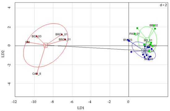 The BIC analysis used to assess the optimal number of clusters identified three genetic clusters (K = 3). A scatterplot of the first two principal components of the DAPC, accounting for 16% of the total variance, is shown in Figure 2 in order to describe the relationship among the clusters. The distribution of the genotypes among the three clusters is reported in Table 3.