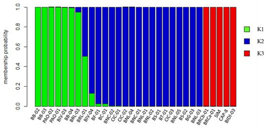 Cluster 1 and 2 (C1 and C2) resulted to be genetically similar and partially overlapped. In these two clusters, both distributed Bufala and Bufala-related genotypes are distributed. Thirteen out of twenty Bufala landraces (65%) were grouped in C2, thus representing the main Bufala cluster, together with four Bufala-related landraces (BIV-03, BIV-04, PAO-01 and PAO-02). Five Bufala landraces (BRL-01, BT-01, BS-02, BB-04, BG-03) and the three Ciciredda landraces (CIC-01, CIC-02 and CIC-03) were grouped in C3, suggesting a genetic differentiation from the Bufale core cluster. Cluster 3 (C3) is clearly separated from the other clusters; it includes the outgroup of durum wheat varieties (BIDI-03, SIM and CAP-8) and two Bufala landraces (BRCa-01 and BRCb-01). Due to the low discriminant power of the DAPC analysis and the partial overlapping when considering C2 and C3 clusters, a STRUCTURE analysis was further performed. The analysis consists of a Bayesian model-based clustering method. The number of subpopulations (K) was identified based on Delta K values [30]. The highest value of Delta K was found at three clusters (K = 3) (Supplementary file S1—Figure S1). The STRUCTURE bar graphic also provides information on the level of admixture in the study sample. At K = 3, 29 genotypes out of 30 (97%) were assigned to one or another group with more than 70% posterior membership probability (Figure 3). The remaining “Bufala rossa lunga 01” (BRL-01) resulted in a 50% probability of belonging to K1 and 50% to K2. Individual assignments provided by STRUCTURE resulted in more discriminants than those provided by DAPC.