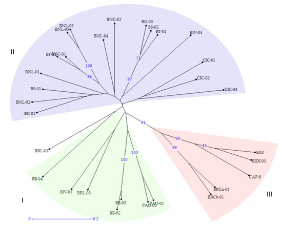 A phylogenetic analysis was also carried out. The analysis, based on Nei [31] genetic coefficient and the neighbor joining algorithm, generated a dendrogram underlining three main groups overlapping with the clusters identified by the STRUCTURE analysis (Figure 4). Bootstrap higher than 70% resulted in the most important nodes, avoiding any misclassifications (Figure 4). As expected, the outgroup of durum wheat varieties, together with BRCa-01 and BRCb-01 rivet landraces, showed the highest values of genetic distance from the other groups.
