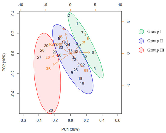 Principal Component Analysis (PCA) of morpho-agronomic traits in 30 tetraploid wheats. Colored ellipses represent the groups identified in the phylogenetic analysis. Genotypes are numbered from 1 to 30: PAO-02 (1), PAO-01 (2),BB-02 (3), BB-03 (4), BB-04 (5), BRL-03 (6), BIV-03 (7), BRL-01 (8), BIV-04 (9), BNC-01 (10), BNC-02 (11), BNL-01 (12), BNL-02 (13), BNL-04 (14), BC-01 (15), BS-01 (16), BT-01 (17), CIC-02 (18), CIC-03 (19), BS-02 (20), BNL-05 (21), BNL-03 (22), BG-03 (23), BF-01 (24), CIC-01 (25), BIDI-03 (26), SIM (27), CAP-8 (28), BRCb-01 (29), BRCa-01 (30). Traits associated with sample discrimination are indicated in the plot: habitus (HA), time of earing (E), culm height (CH), ear length (EL), awns length (AL), ear shape (ES), ear density (ED), 1000-kernel weight (KW1000).