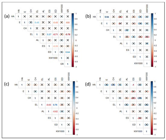 Pearson correlation matrix of 8 morpho-agronomic traits of tetraploid wheats. Numbers indicate the correlation coefficient: positive correlations are displayed in blue and negative correlations in red. Non-significant correlations (p > 0.05) are marked by a black cross. (a) Trait correlation among all the genotypes (the membership group identified in Figure 4 is included in the analysis as the “Group” variable); (b) trait correlation among the genotypes of “Group I”; (c) trait correlation among the genotypes of “Group II”; (d) trait correlation among the genotypes of “Group III”. Habitus (HA), time of earing (E), culm height (CH), ear length (EL), awns length (AL), ear shape (ES), ear density (ED), 1000-kernel weight (KW1000).