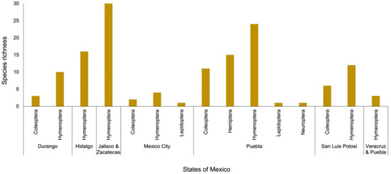 Chicago/Turabian StyleTenorio-Escandón, Perla, Alfredo Ramírez-Hernández, Joel Flores, Jorge Juan-Vicedo, and Ana Paola Martínez-Falcón. 2022. "A Systematic Review on Opuntia (Cactaceae; Opuntioideae) Flower-Visiting Insects in the World with Emphasis on Mexico: Implications for Biodiversity Conservation" Plants 11, no. 1: 131. https://doi.org/10.3390/plants11010131