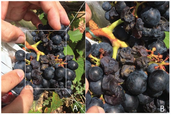 (A) Cluster of Vitis vinifera cv. Trincadeira infected with Botrytis cinerea at the harvest stage (EL38). Symptomatic infected grapes in the centre of the cluster show signs of dehydration, and sporulation of B. cinerea was visible, which is highlighted in (B).