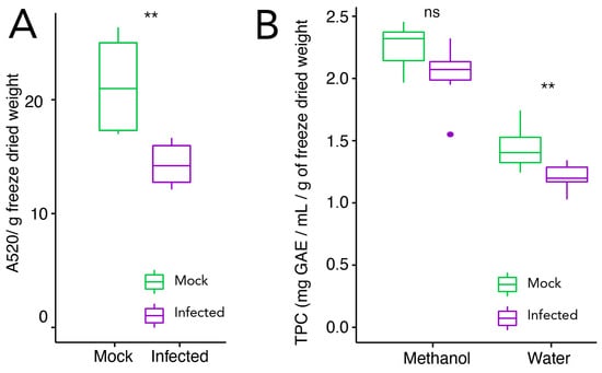 Evaluation of (A) total anthocyanins content (absorbance 520 freeze dried weight) and (B) total phenolic content (TPC) extracted with methanol or water (gallic acid equivalent (GAE) freeze dried weight) in V. vinifera cv. Trincadeira grapes at the harvest stage (EL38) (mock and B. cinerea infected). Box-and-whisker plots represent the minimum, first quartile, sample median, third quartile, maximum, and outliers. Total anthocyanins data were analysed with the Wilcoxon–Mann–Whitney test, and TPC data were analysed with the t-test. Asterisks indicate significant differences between control and infected samples within each method: ** p value < 0.01; ns: not significant.