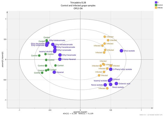 Principal component analysis (Figure S1) including both free and glycosidic VOCs provided a global overview, indicating a trend in separation between control and infected samples, with the first two principal component explaining 48% of the variance. Samples infected with B. cinerea were separated from the other samples along PC1. The resulting Orthogonal Projections to Latent Structures—Discriminant Analysis (OPLS–DA) (Figure 3) was used to model and identify the main contributors to the separation between mock and infected samples. Only the variables that had a variable influence on projection (VIP) score above 1 were considered for the biplot. Along the PC1, B. cinerea infected samples were separated from mock samples, and separation was driven by ester acetates (infected) and fatty acid esters (control). Further statistical differences in VOCs between the control and infected samples were confirmed by comparison tests. The VOCs detected but not quantified in both the control and infected samples were excluded from the analysis (trace VOCs were those considered < 0.05%).
