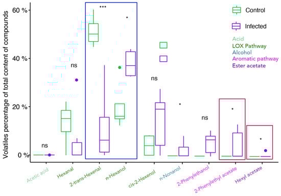 Evaluation of free volatile organic compounds in V. vinifera cv. Trincadeira grapes at the harvest stage (EL38) (mock and B. cinerea infected). Sample quantities were normalised for the percentage of total content of compounds (total compounds not shown). Box-and-whisker plots represent the minimum, first quartile, sample median, third quartile, maximum, and outliers. Data were analysed with the t-test or Wilcoxon–Mann–Whitney test depending on non-parametric/parametric distribution. Asterisks indicate significant differences between control and infected samples within each compound. * p value < 0.05; ** p value < 0.01, *** p value < 0.001; ns: not significant.