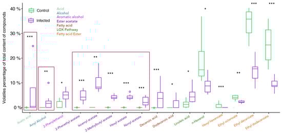 A total of 36 different free and glycosidic VOCs were detected from either the control or infected samples using Gas Chromatography—Mass Spectrometry (GC–MS) and Gas Chromatography—Flame ionization detector (GC–FID). The relative amounts of the identified components after normalization are listed in Table 1, following their elution order on the DB-1 fused-silica column as described in the Materials and Methods section. The detected VOCs belong to the families of alcohols, fatty alcohols, aromatic alcohols, fatty acids, acids, alkanes, C6 derivatives from LOX pathway, ester acetates, and fatty acid esters. The full list can be found in Table S1.