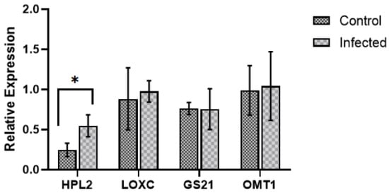 The first enzymatic step in the LOX pathway catalyses linoleic acid or -linolenic acid in fatty acid hydroperoxides. We analysed three LOX genes, VVLOXA, VVLOXC, and VVLOXD, that were not differentially expressed (Figure S2). The resulting products were then metabolised by HPL, producing short-chain aldehydes that can be isomerised. Three HPL genes were tested: VVHPL2, VVHPL5, and VVHPL6. The gene VVHPL2 showed a statistically significant increase in expression in infected samples (Figure 6). A third relevant enzyme family is the ADH, which oxidases C6-alcohols to the corresponding aldehydes. The genes VVADH1, VVADH2, and VVADH3 were analysed; however, no change was noticed in their expression under infection (Figure S2). As most of detected VOCs were present in the glycosidic form, five genes coding for GS were also investigated: VVGS6, VVGS9, VVGS16, VVGS21, and VVGS25, but none were differentially expressed under infection. The same holds true for VVOMT1 and VVOMT2, genes coding for enzymes that play an important role in aroma-related pathways [37].
