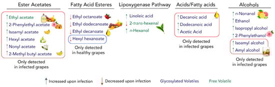 The direct analysis of the grape juice revealed a limited number of VOCs, confirming the non-aromatic grape profile. Therefore, grape juice from the same samples was treated with -glycosidase to cleave VOCs glycosidic bonds. This revealed a high diversity of VOCs, showing the potential for aromatic wines from cv. Trincadeira grapes. In the VOCs obtained after glycosidase treatment, 22 out of the 28 glycosidic VOCs showed statistical differences upon infection (Figure 5). After the removal of glycosidic moiety, the VOCs hexanoic acid, octanoid acid, isopropyl alcohol and hexanal were detected only in infected grapes and only in trace amounts (<0.05%). Ethanol, ethyl acetate, and isopropyl alcohol were all statistically higher in infected samples but, due to their high percentage, were removed from the calculations, as explained in the Material and Methods section. Linoleic acid, a precursor from the LOX pathway increased in content upon infection and its derivative n-hexanol decreased in content. Five ester acetates, isoamyl acetate, 2-methyl butyl acetate, hexyl acetate, nonyl acetate, and 2-phenethyl acetate, were detected only in infected samples, representing 30% of total glycosidic VOCs. Decanoic acid and dodecanoic acid were also detected only in infected samples increasing from 1% to 11%. The aromatic alcohol 2-phenylethanol increased upon infection. Fatty acids esters decreased upon infection from 76% to 34%, namely hexyl hexanoate, ethyl octanoate, ethyl decanoate, and ethyl dodecanoate.
