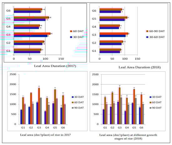 Leaf area and leaf area duration of short grain aromatic rice varied significantly with integrated nutrient management practices and given the highest values in 50% RDF + 50% RDN (FYM) being at par with 75% RDF + green manuring (Figure 2). The total dry matter of aromatic rice enhanced with the progression of the crop age and touched the highest at harvest (Table 5). The enhancement rate was slower during the first 30 DAT but got increment after 60 DAT due to the formation of reproductive parts. The rate of increase was maximum during 60–90 DAT. The treatment consisting of 50% RDF + 50% RDN (FYM) increased total dry matter at 30, 60, and 90 DAT, respectively. At harvest, significantly maximum dry matters (770.4 and 757.1 g/m2) were obtained due to the application of 50% RDF + 50% RDN through FYM being at par with the application of 75% +green manuring (743.9 and 757.7 g/m2). The lowest values were obtained by application of 50% RDF + 25% RDN through FYM during different growth stages in the study period (Table 5). Leaf area duration (LAD) of aromatic rice increased from 30–60 DAT to 60–90 in all treatments applied. Significantly higher LAD (105.0 and 115.3 days) at 30–60 and 60–90 DAT were obtained with 50% RDF + 50% RDN (FYM) closely followed by 75% RDF + green manuring (100.2 and 111.3 days in 2017 and 2018, respectively). The least values (78.3 and 81.9 days) were observed in 50% RDF + 25% RDN through FYM treatment (Figure 2).