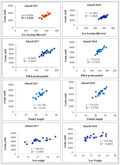 Significantly higher straw yield (5278, 5342 kg/ha) in 2017 and 2018 was found by the treatment comprised of 50% RDF + 50% RDN (FYM) over other treatments being at par with 75% RDF + green manuring (4924 and 4931 kg/ha). Further results showed that the treatments receiving 75% RDF + 25% RDN through FYM and 50% RDF + green manuring were at par with each other. The lowest values were obtained from 50% RDF +25% RDN through FYM in both the years of study. Among different INM practices followed, a significantly higher harvest index (42.1 and 42.2%) was recorded with the treatment consisting of 50% RDF +50% RDN through FYM being at par with the treatment comprised of 75% RDF + green manuring in 2017 and 2018. The lowest straw yield was obtained from 50% RDF + 25% RDN through FYM (37.5 and 37.4) (Table 6). Correlation studies revealed that a positive and strong correlation existed between grain yield and yield parameters of rice like filled grains/m2, ear bearing tillers, panicle length, and positive correlation between grain yield and test weight (Table 7 and Figure 3).